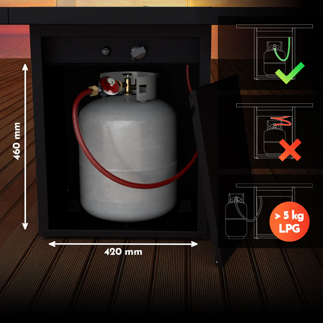Het geïntegreerde gaskompartiment verbergt de gasfles, waardoor je buitenruimte strak en stijlvol blijft. Geen zichtbare gasflessen, alleen een moderne en sfeervolle vuurtafel.