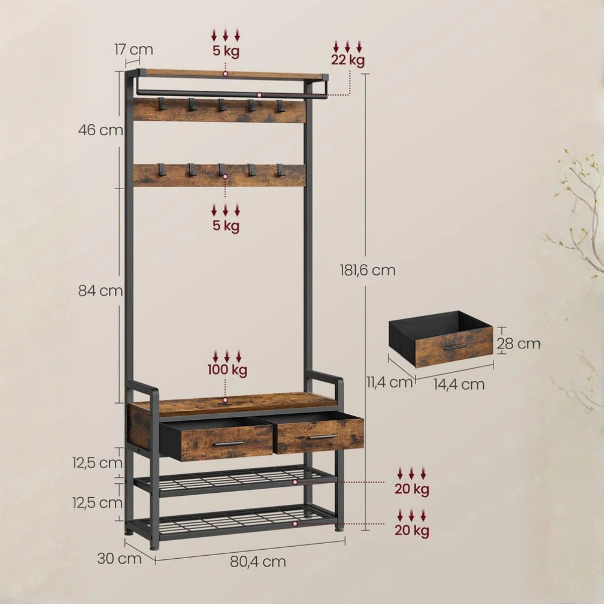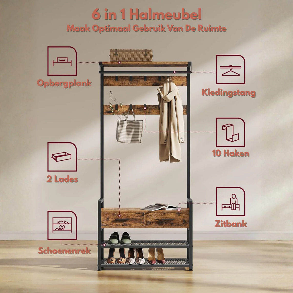 Kapstok met Schoenenrek, Lades en Kledingroede – 6-in-1 Halmeubel