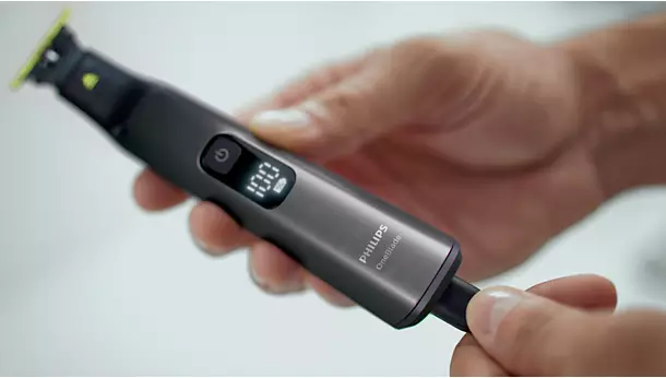 Zorg ervoor dat uw OneBlade altijd klaar is voor gebruik door het digitale LED-display in de gaten te houden. U wordt geïnformeerd wanneer de batterij bijna leeg raakt tijdens gebruik en wanneer de stekker in het stopcontact zit om de OneBlade op te laden. Activeer de reisvergrendeling om de OneBlade overal mee naar toe te nemen.