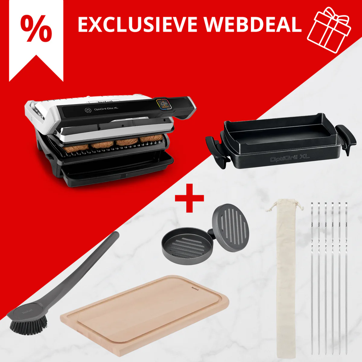 Ontdek het ultieme Optigrill Elite XL web pack, bestaande uit Optigrill Elite XL, een bestseller, een exclusief snack- en gebakaccessoire, een hamburgerpers en spiesjes om nog meer recepten te maken, en een houten snijplank.