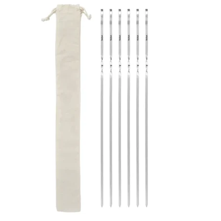 Set van 6 herbruikbare roestvrijstalen spiezen met plat ontwerp, ideaal voor stabiel grillen. Dankzij de lange afmetingen geschikt voor grills van elk formaat. Wordt geleverd met een katoenen opbergzakje voor gemakkelijk meenemen en opbergen.