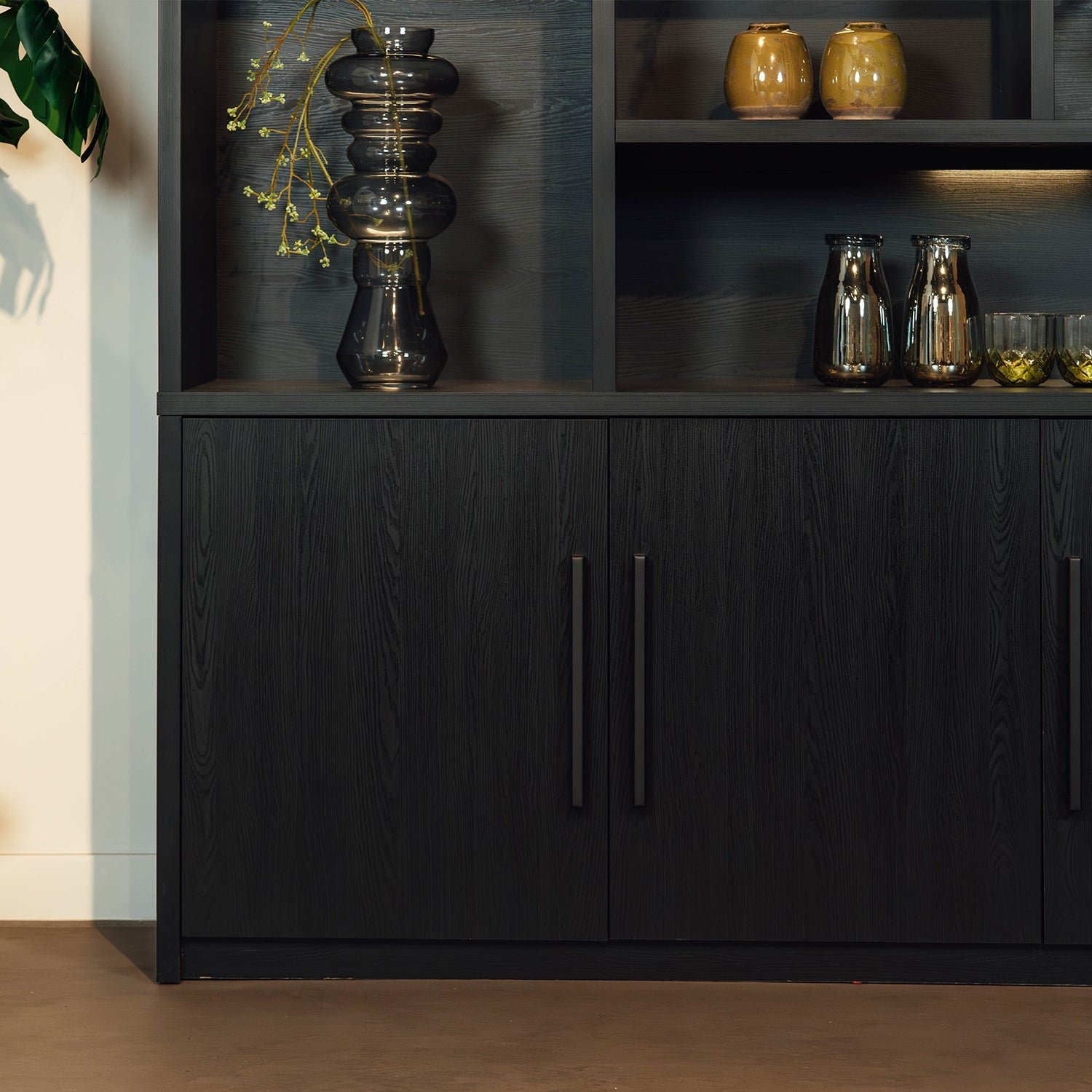 De 180 cm (180x45x187 cm): Deze variant beschikt over 3 deuren en 6 open vakken, waardoor hij nog meer opbergruimte biedt en perfect past in grotere woonruimtes. De kleine open vakken in deze kast hebben de afmetingen 85x43x33, 55x43x33, 55x43x70cm. Het grote open vak heeft de afmeting 114x43x33cm. Ook bevinden zich 6 ingebouwde ledlampen in de kast.